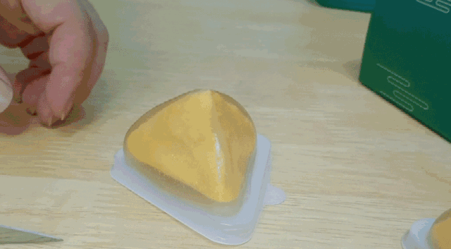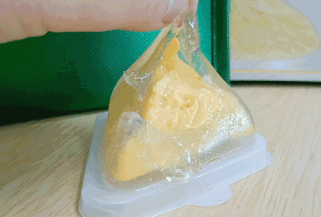 外皮微软,榴莲馅部分解冻,流心慢慢溢出。