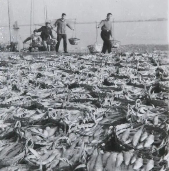 上面这个图其实并不能形容刀鱼之多,但下面这个图可以,这铺天盖地胡乱堆在地上的,都是今天价值连城的刀鱼。 ![]()