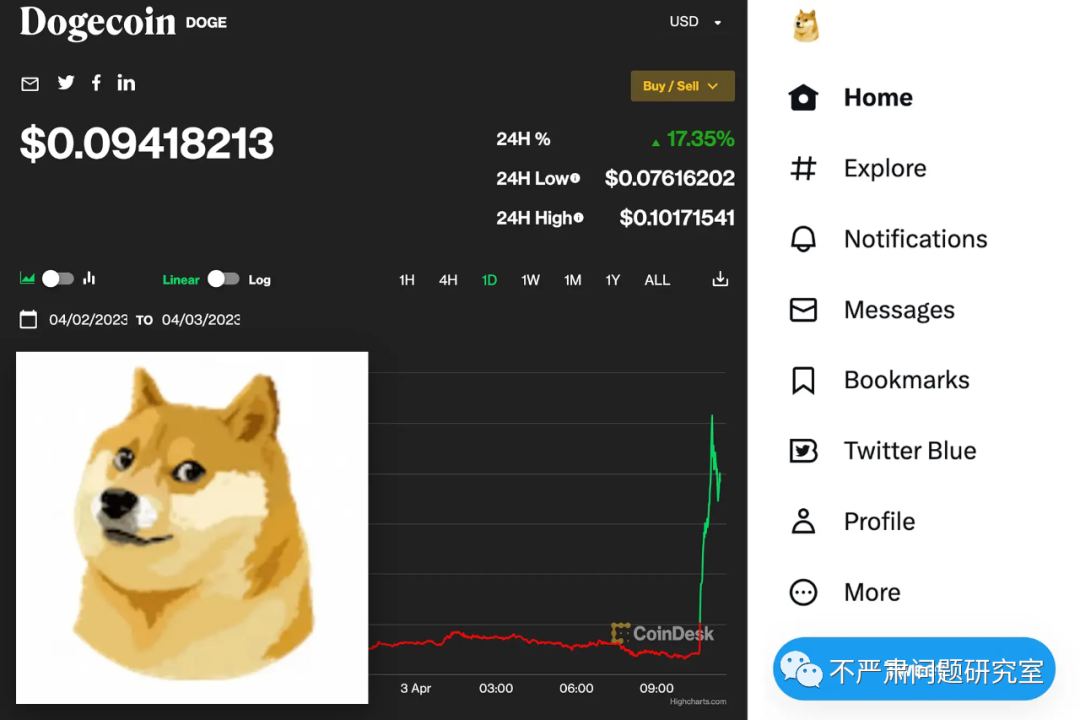 今年4月,马斯克又将推特网站上的蓝鸟LOGO换成了狗头,狗狗币应声狂飙30%,3天后马斯克又把狗头换回蓝鸟,狗狗币大跌9%,一来一回又赚了好几亿。