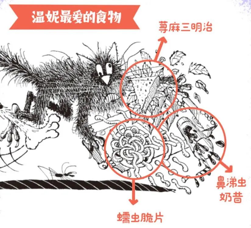 作为女巫,温妮的食谱可不一般:爱吃的食物有蠕虫脆片、大象脚指甲饼干、油炸苍蝇馅饼、加了蜗牛糖浆的麦片粥……