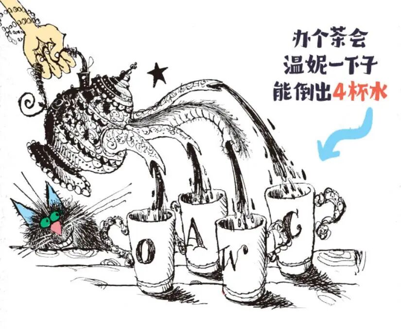 机智的温妮变出了一个有四个壶嘴的茶壶,这样大家都能坐在最好的位置,喝到第一杯茶了!