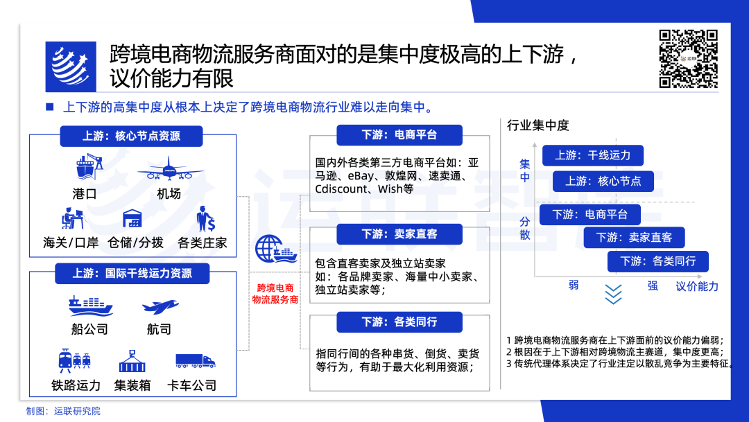 4)全托管模式会在一定程度上提升行业集中度,但不会改变行业基本竞争格局。所谓全托管,简单来讲就是平台脱离了字面上的“平台”属性,不再是居中协调的角色,而是“亲自下场”,作为事实上的卖家直面消费者。全托管模式下,平台作为流量入口,将传统意义上的卖家、平台之间的业务边界及其价值空间,进一步下沉和重新分配。总的来说,平台凭借其流量霸权,以及给到卖家的未来增长预期,占领了原本属于卖家的操刀空间。两者之间的关系,简化为了供货方与“大卖家”的,话语权差异更加悬殊的上下游关系。无论是起手就押注全托管的TEMU,还是新近开始全托管尝试的Aliexpress、TikTok、Shopee、Lazada们,都有一个共同的时代背景。那就是,全球疫情消退,生产生活节奏逐步恢复。这样的大环境下,线上线下零售渠道逐渐回归疫情前的基本格局,常规商业逻辑回到支配地位,存量竞争的主基调,日益成为跨境电商出海所有参与主体的头等大事。增量的获取和可持续增长动能的识别及抓取议,显得更加急迫。抓取增量最简单粗暴的手段,就是扩大自己的价值获取范围,从广度和深度上,拿到更多的变现节点和主业掌控控制点。而全托管模式,恰好契合了电商平台们获取跨境电商业务增量的核心诉求。蛋糕变大的速度,无法匹配业绩增长雄心的竞争环境中,电商平台尝试将业务触角向上下游延伸,掠夺原本属于垂直专业玩家的价值空间。这场“侵略战争”中,电商平台们凭借流量霸权,天然具备碾压式的降维打击力道。但是,基于运联研究院的“能力边界”理论,我们认为,这场价值链重构的争夺战中,基于供应链管控能力的跨境电商物流交付能力,和选品、店铺运营等垂直能力,二者其实是有着本质的不同。电商平台的能力边界,能否扩张到跨境电商物流的核心领地?全托管模式下,极度散乱的跨境电商物流行业是否会被平台推着走向高度集中?什么类型的跨境电商物流企业,能够在全托管模式中生存下来,甚至发展壮大?1.3 全托管模式其实是平台流量霸权变现的必由之路抛开模式拆解,回归到全托管模式的商业属性本身,其实有一条很明晰的利益主线。那就是,平台作为流量入口,本能上具有最大化变现渠道的意识和欲望。这种情况下,全托管模式的推出可以说是顺理成章的结果。但对于物流交付来说,平台本身的物流交付水平缺失或不足的现实情况之下,全托管模式在物流职能上的实际落地姿势,还是要切分清楚,完全自营和部分或全部外包合作,以及,分阶段采取不同的物流能力建设策略,本质上是有差异的。讨论全托管会否引起行业走向集中,以及,具备哪些特质的跨境电商物流企业,能够在此背景下获得更大的业绩增长空间,一定要先找到一个坚实的起点。即,搞清楚跨境电商物流行业的分散竞争,究竟是什么原因导致的。观察跨境电商物流的产业链结构,我们会清晰地看到,其上下游的参与主体以及参与主体的市场集中度,进而了解跨境电商物流服务商在整个产业链中的话语权强弱。一个初步结论是,跨境电商物流服务商是在夹缝中生存,这直接造成了跨境电商物流市场的散乱状态。行业弱势地位直接表现为持续的同质化竞争。这进一步导致了同条线路上,大家互相卖货、卖柜子,形成“你中有我”“我中有你”的现象。而彼此间业务竞合的并存,进一步决定了大家不会出现数量级上的营收规模差异,更不会出现一家独大或几家独大的竞争格局。跨境电商物流行业分散的竞争格局,根源于企业不具备产生网络效应的基因。首先,对于支撑跨境电商物流企业在特定走货线路的核心资源来说,其在不同路向上天然具备专用属性,谈不上有什么复用。其次,即便在同一路向国,跨境电商物流企业在不同口岸的资源积累,也天然具备属地化的专用属性,互相之间无法高度链接,也就无法实现成本的快速摊薄。以卡车拖头和车架为例。即便是自建车队,也是围绕主要目的港而布置的,承担着该港口(口岸)专属运力的角色。除非出现频繁跳港的情况,否则基本不会出现资源使用效率层面的成本优势。同时,出口跨境电商物流遵循,以贴近国内跨境电商集群或产业集群位置的资源布局导向。国内段,可以存在集货仓或分拨中心之间的调拨联动;但由于跨境电商物流服务商的国内节点位置设置,往往是兼顾卖家集群及出货口岸区位的结果,而非基于轴辐式网络走货路由优化的考量;因此,跨境电商物流企业的线路布局概念里,并不存在最优路径的概念,也就不存在国内节点间高频互联互通的可能。此外,由于出口跨境电商物流货物流向属于典型的单向流动的喇叭口模型,目的国普遍依赖本土派送商网络或走货能力。因此,对目前阶段的跨境电商物流服务商而言,在海外段基本无法形成极度密集的网点铺设,也无法形成高频的网点资源间的横向互动,以及与走货方向相反方向的逆向流量。2.3 新变局视角:从流量入口开始整合会形成一时的局部降维打击平台作为流量入口,全托管对物流行业的影响,也需要分阶段看。初期和局部阶段,也许会直接形成以平台和主营市场为单位的体量巨大(与平台流量相匹配)的物流订单承接者。但长远来看(如果全托管模式可以被市场证明行之有效),全局上依然很难促成跨境电商物流行业的高度集中(如CR5在50%以上)。