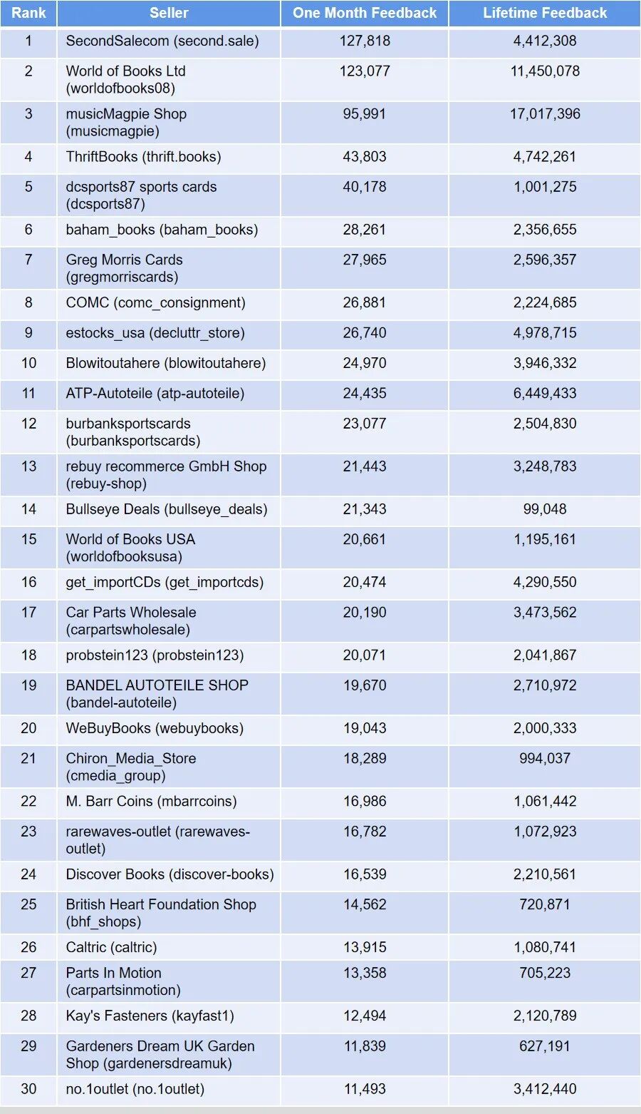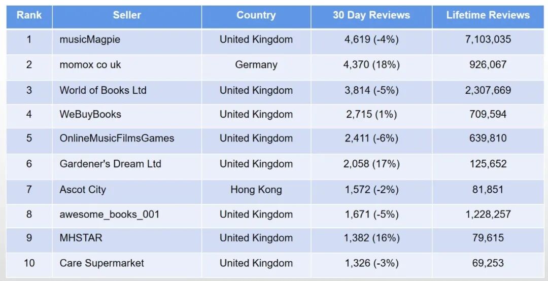 榜单排名基于过去30天内收到的积极评论数量。2023年5月,全球前100名的eBay卖家中,有36家来自美国,34家来自英国,20家来自德国。