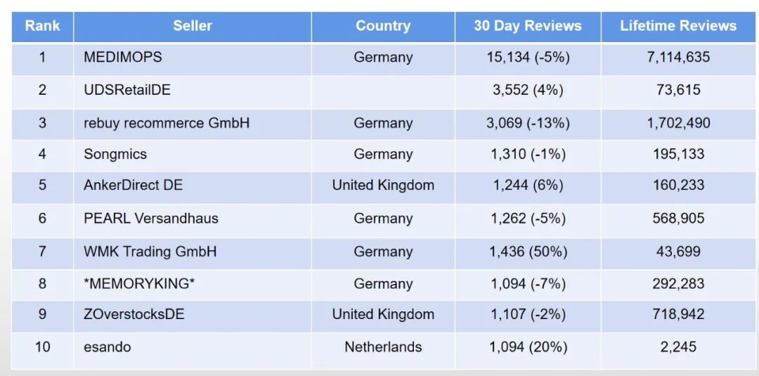 德国:名单中的100名卖家中,75名来自德国,6名来自中国,5名来自荷兰,3名来自中国香港。