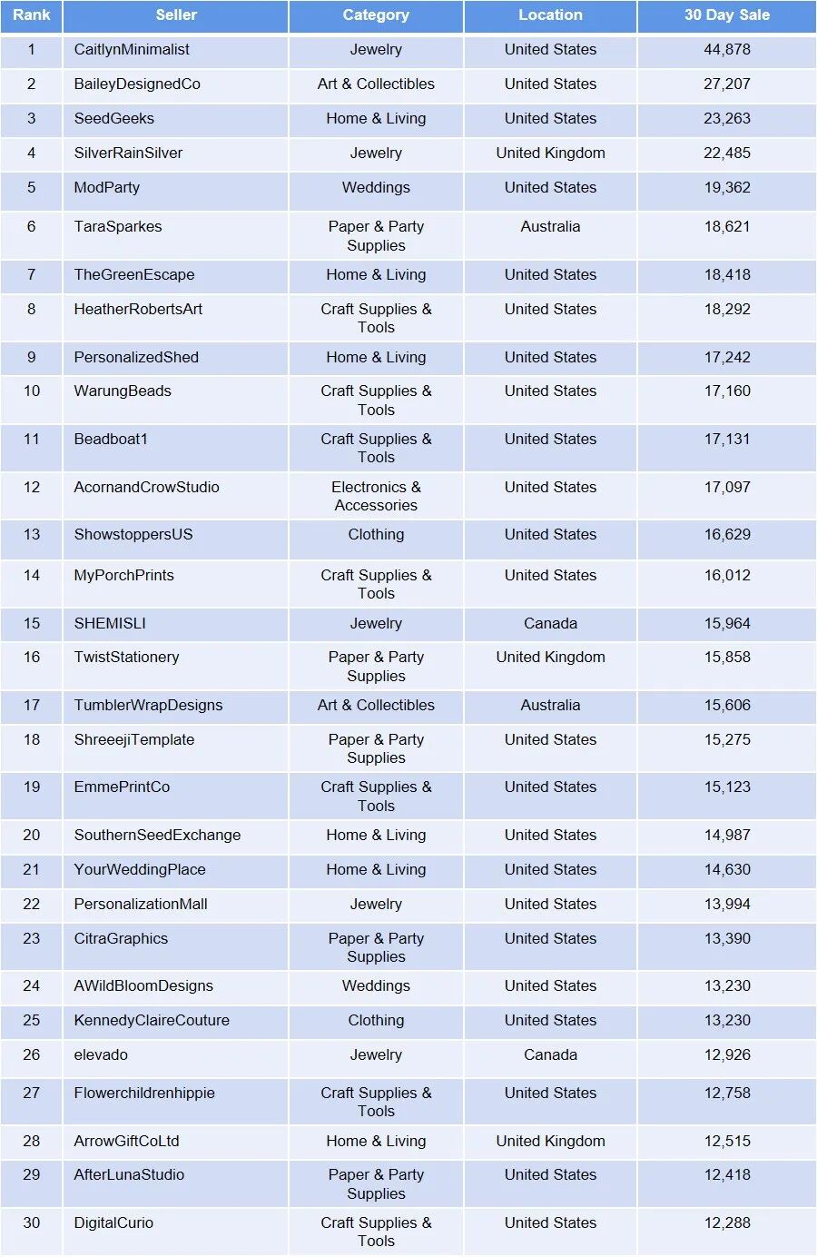 EtsyTop 100榜单是基于过去30天内卖家店铺销售额来排名的。