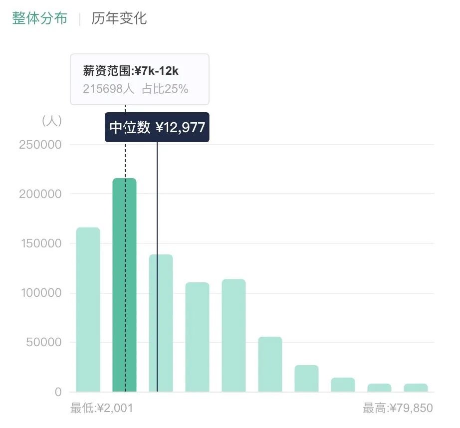 从整体薪资分布的中位数上来看,人数占比最多的薪酬区间为7k-12k,占比达25%,薪资约12k/月。
