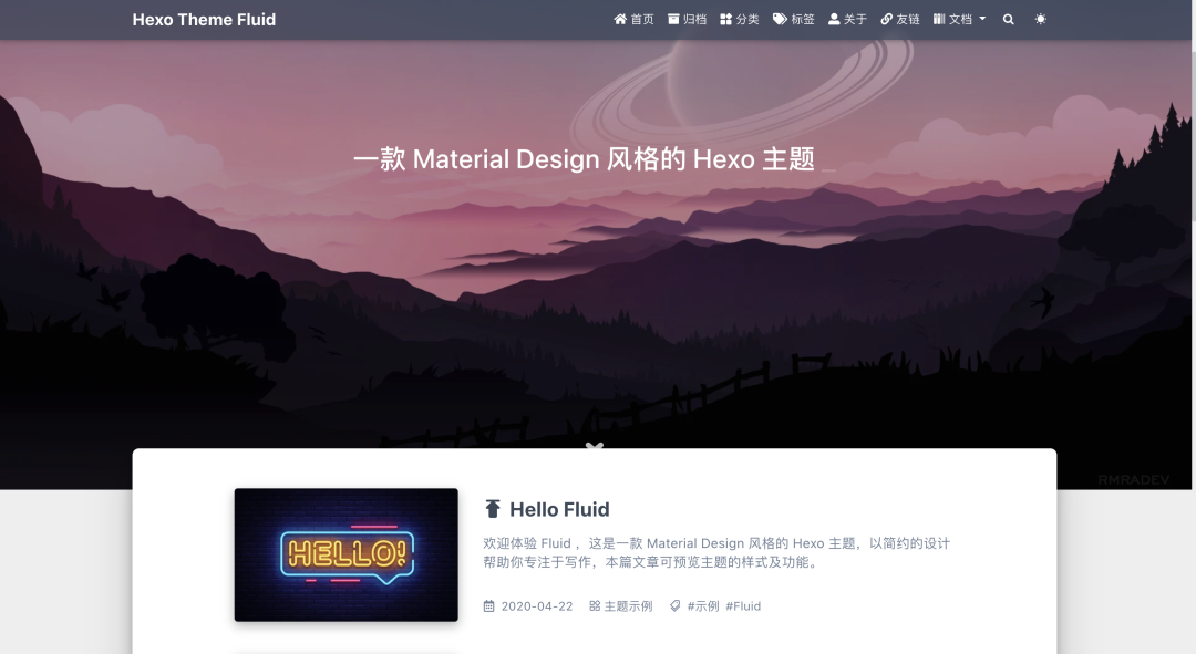 Fluid 是一款 Material Design 风格的 Hexo 主题博客,其提供了详细的搭建教程。Fluid 支持页面组件懒加载、多种代码高亮方案、多语言配置、多款评论插件、网页访问统计、文章本地搜索、暗色模式、脚注语法、LaTeX 数学公式、mermaid 流程图等。