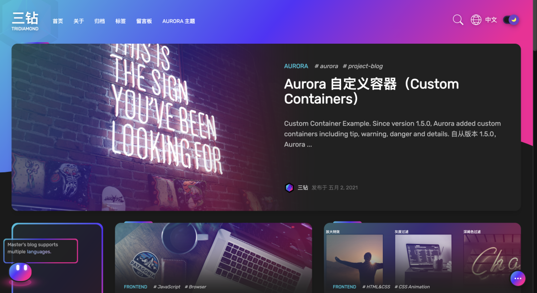 Aurora 是一款基于 Vuepress 2 的博客主题,将本地 Markdown 文件解析成静态 html 页面,作为博客文章。搭配说说,时间轴,文章分类,评论,友情链接,相册,音乐播放器等特色功能,给你不一样的使用体验。