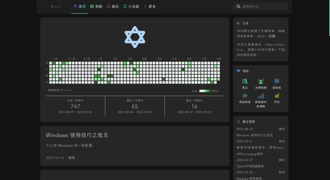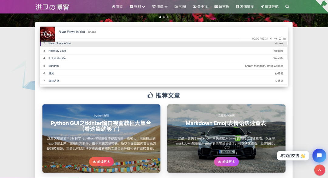 一个简洁美观的博客系统,基于Hexo开发,其支持图片瀑布流、自定义主题颜色、内置/外置搜索、侧栏备案信息、网页访问统计、支持多款评论插件、内置多语言、图片懒加载、社交按钮等功能。