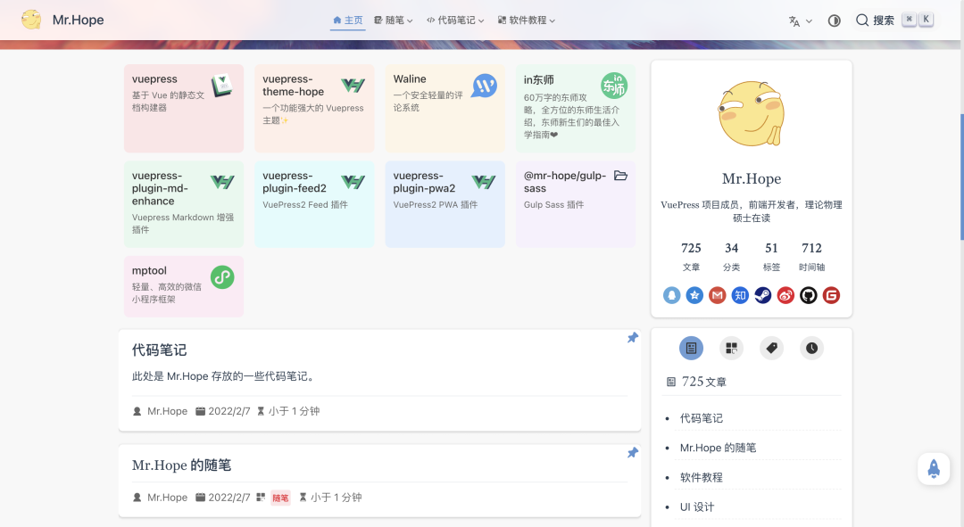 vuepress-theme-hope 是一个具有强大功能的 vuepress 主题,基于 VuePress2, 带有 Vite2 / Webpack5和 Vue3 的强大功能。支持文档和博客。其在 Vuepress 的基础上引入了很多实用的功能,并且对 Markdown 进行了增强,非常实用!