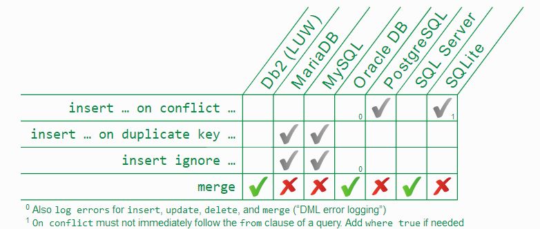 这是一个特有的SQL扩展,即它不是标准SQL的一部分,因此在下面的矩阵中是灰色的。但是,SQLite遵守与PostgreSQL相同的语法来实现此功能0。该标准提供了对merge语句的支持。