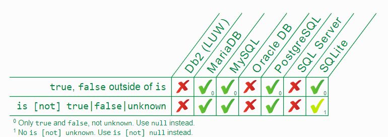 SQLite中对布尔字面量和布尔判断的支持现在和其他开源数据库接近,唯一的差距是SQLite不支持is[not] unknown(你可以使用is [not] null来代替)。有趣的是,这些功能在下面提到的商用产品中还不可用。