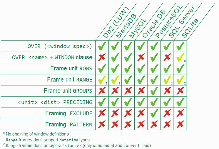 SQLite对over子句的支持与其他数据库非常接近。唯一值得注意的限制是range语句不支持数字或间隔距离(仅支持current row和unbounded preceding|following)。在发布sqlite 3.25.0时,SQL Server和PostgreSQL具有同样的限制。PostgreSQL 11消除了这一限制。