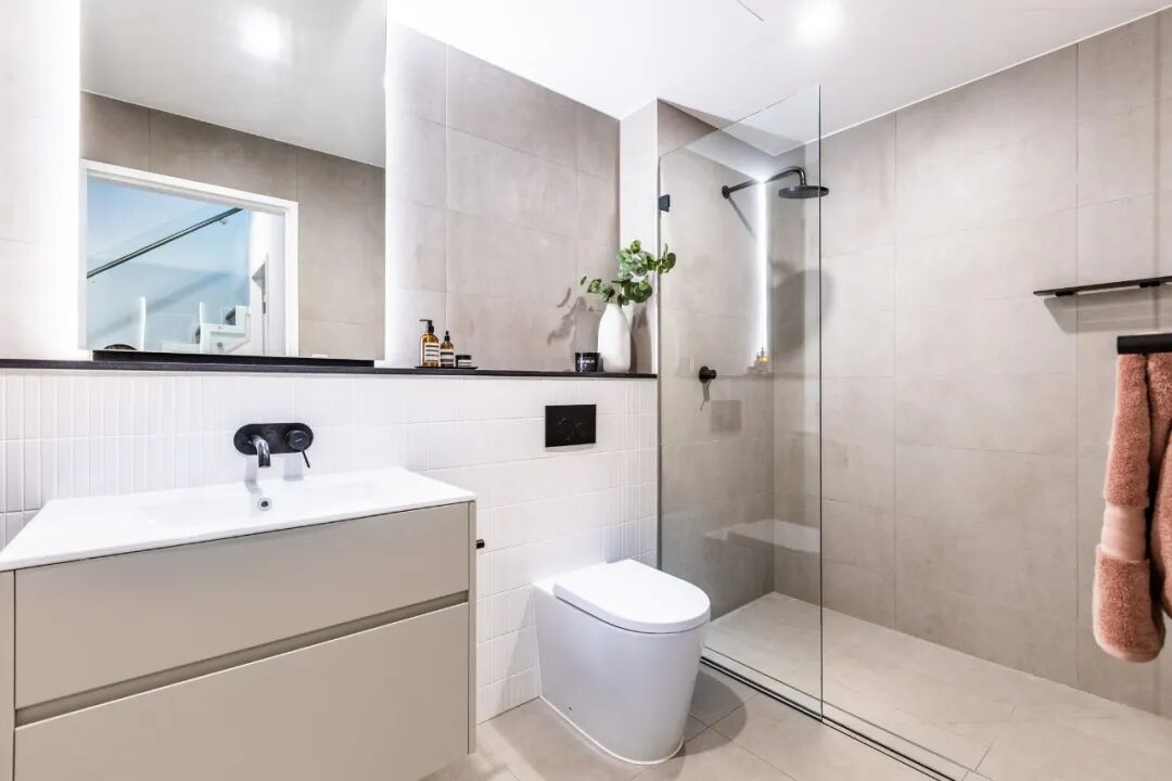 浴室全面墙的仿水泥花纹的灰色瓷砖,防霉防潮。镜子的背灯在照明的同时不会让光线过于刺眼。