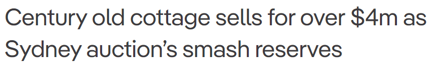 拍卖师Scott Kennedy-Green(图片来源:RealEstate)拍卖师Scott Kennedy-Green告诉围观群众,该住宅在获得批准的情况下拥有无限的发展潜力,并强调了该房产在100年来首次上市的这一事实。据该报道指出,该房产的起拍价为300万澳元,价格在拍卖活动中缓慢攀升至400万澳元。活跃的竞标者也很快从6个变成了2个,其中包括一个年轻的家庭和一个买家中介。最终,该家族以领先另一竞标者5000澳元的竞标价,成功拍得这栋最终价值为401.6万澳元的房产。最终成交价也比底价高出20多万澳元。这栋房子引起了翻新者和建筑商的兴趣。(图片来源:RealEstate)这栋位于Wahroonga的“金三角”地段的房子已被同一个家族持有100年,翻新者和建筑商均对其感兴趣。据悉该房产没有被列入遗产名录,但位于保护区域内。McGrath的房产中介Nick Muzha表示,他对这个结果感到很兴奋,因为几周前,相隔两栋房子外一套“宜居”的房产也以将近410万澳元的价格售出。他说:“这显示了实力。这里是Wahroonga,该房产在一个保护区内,朝北,并处于一个很大的地块上。”据报道称,该房屋是冬季首个周末拍卖会上以超过底价成交的众多房产拍卖会之一。该房屋的拍卖吸引了超过100人围观。(图片来源:RealEstate)新州Ray White的首席拍卖师Alex Pattaro表示,本周的清盘率是自2021年底以来的最高水平。“拍卖竞争激烈,应该会给卖家带来交易的信心。”他说,“悉尼房地产市场开始滚雪球,并获得强劲的发展势头。拍卖仍然是最佳的销售方式,能向买家展示还有其他有信心的买家希望成功购房。”PropTrack的经济研究总监Cameron Kusher透露,本周悉尼各地有626场拍卖会,较去年增长17%。然而,冬季的开始意味着拍卖活动的减少,据悉下周只有477场拍卖。对此Kusher表示:“随着我们进一步进入通常比较安静的冬季销售季节,这是可以预料的。”![]()