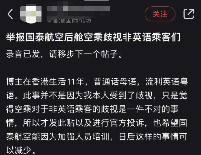 这起事件起因一位网友实名举报国泰空姐歧视非英语乘客。