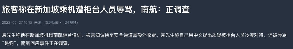 5月23日,我们收到旅客在新加坡乘机遭遇柜台服务人员辱骂的投诉后,及时启动调查,与该旅客持续加强沟通,并表达了我们的歉意。