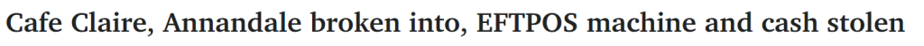 周一凌晨4点左右,警方接到报警,称Annandale的Cafe Claire发生盗窃案,一名身穿深色裤子和荧光背心的摩托车骑手偷走了现金和2台EFTPOS机器。