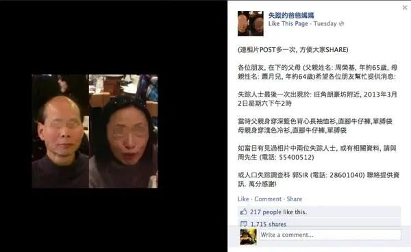2013年3月初,不少Facebook的香港用户都刷到了一个名叫“失踪的爸爸妈妈”的账号。