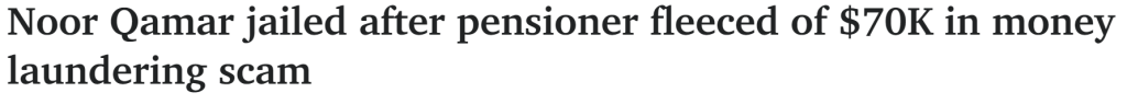 在一起洗钱诈骗案中,一名退休人员被骗走了7万澳元,Noor Qamar被判处18个月监禁(图片来源:《每日电讯报》)