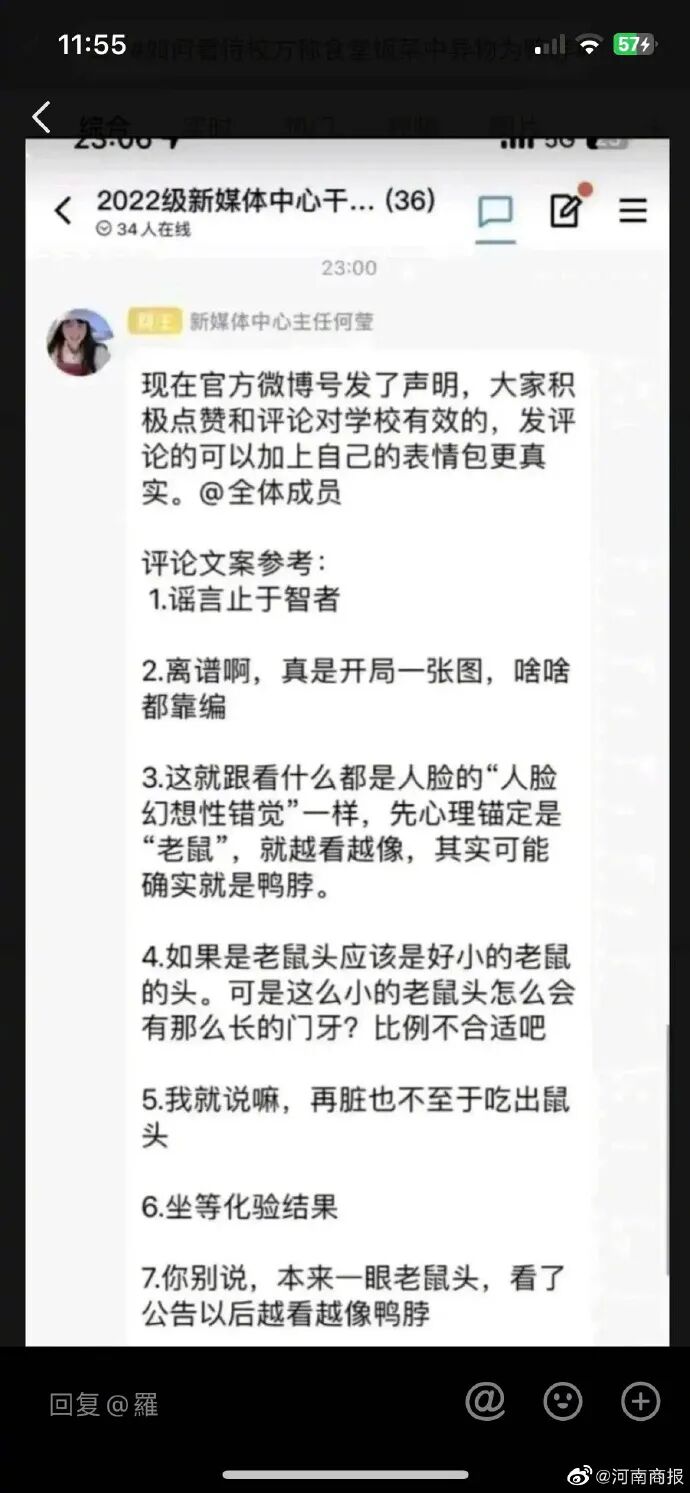 此事激起轩然大波后,学校及相关部门急匆匆发文澄清,称所谓的“老鼠头”其实是鸭脖,不过,这一结论并未让网友们信服,他们质疑学校是在“指鼠为鸭”。