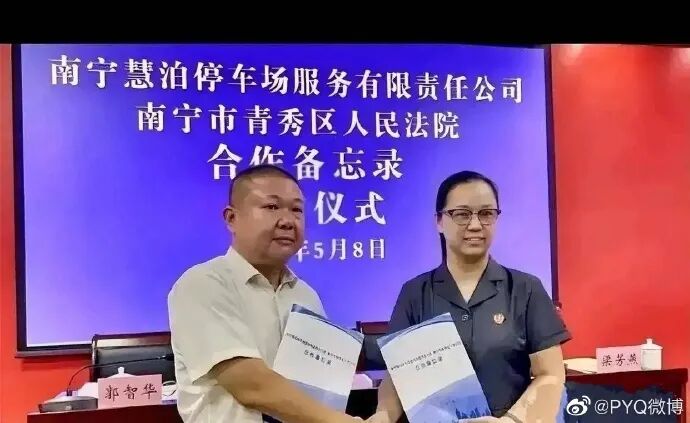 不过,物极必反,慧泊停车仗着国企身份大肆敛财,愈发膨胀了,竟然想出和法院合作,对欠缴停车费的市民展开司法追究——南宁法院与慧泊停车公然签署合作备忘录,为其保驾护航。
