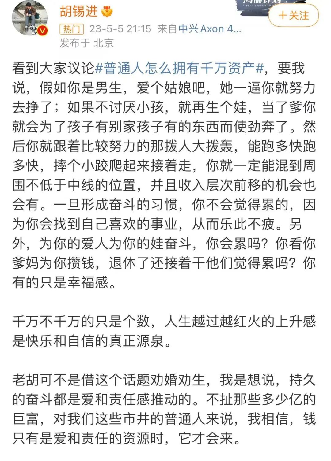 对于这个问题,无所不知的胡锡进是这样回答的:“假如你是男生,爱个姑娘吧,她一逼你就努力去挣了;如果不讨厌小孩,就再生个娃,当了爹你就会为了孩子有别家孩子有的东西而使劲奔了。然后你就跟着比较努力的那拨人大拨轰,能跑多快跑多快,摔个小跤爬起来接着走,你就一定能混到周围不低于中线的位置,并且收入层次前移的机会也会有。”