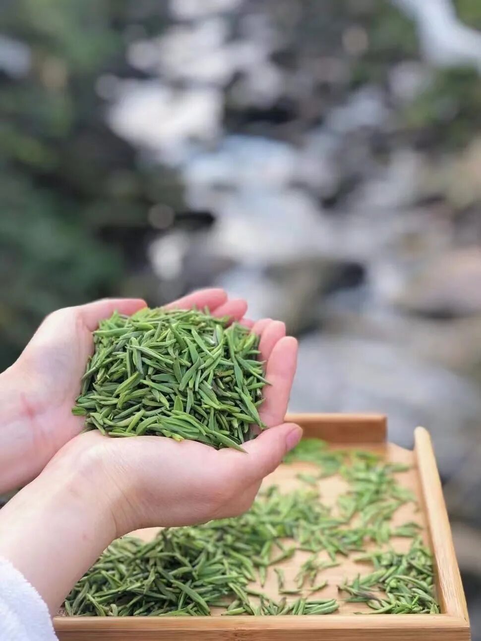 品尝一口,清甜的花香在嘴中迸发,花香中淡淡的蜜奶香,让人回味无穷的同时,燥气尽消。如此珍贵的兰花,精选好的白茶来拼配。像这款窨花茶选用的就是2022年的福鼎高山白茶,一级白牡丹。标准的白牡丹,一芽两三叶,芽头肥硕,叶片细窄,颜色深绿,甜调突出,与兰花相得益彰。茶叶采自福鼎白茶核心产区——管阳,是高山生态茶园基地之一,这里云雾缭绕,山清水秀,整体茶园种植海拔在400-800米之间,雨水充沛,温度平均低于市区2~4摄氏度。优越的地理环境为这里的茶青提供了更好的品质。这也是为何管阳产出的白茶香气高扬,自然甘甜,清雅醇厚。根据传统白茶做法,“不炒不揉,生晒为上”。将茶叶剔除梗、片、暗张等杂质后,用温和的阳光足晒,自然萎凋,再以文火进行烘焙至足干。山场洁净、工艺到位的白牡丹,配以兰香,是“山静兰初放,亭幽竹与清”的雅气。得之于口,会之于心,饮一杯,可忘忧。