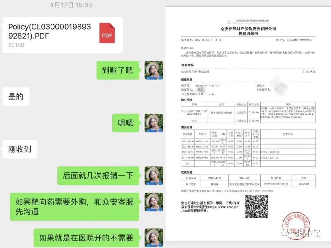 老人家买了众安百万医疗,除去医保报销,能100%覆盖必要合理的治疗费。