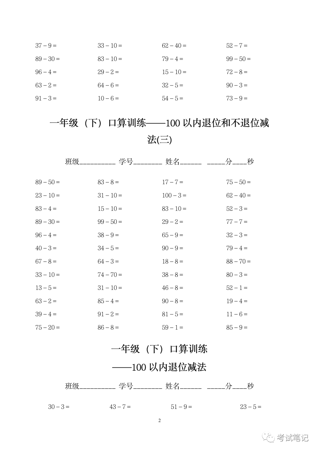 一年级数学下册:100以内退位和不退位减法,100以内退位减法专项训练!