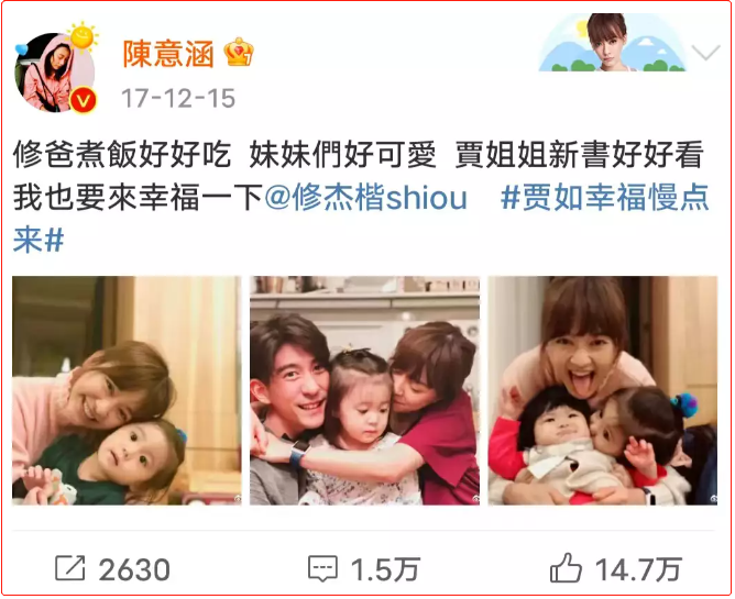 2017年,35岁的陈意涵,在修杰楷和贾静雯已经成婚并有女儿后,还在微博上,公开晒出和“修爸”,以及他和贾静雯女儿,紧紧抱在一起的照片,并配文:修爸煮饭好好吃……