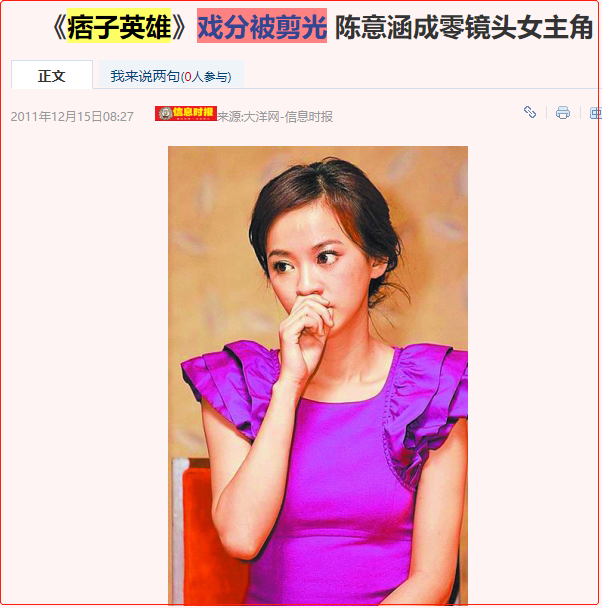 最后,陈意涵在电影里的戏份,被删得一干二净。她因此被媒体嘲讽为“零镜头女主角”。
