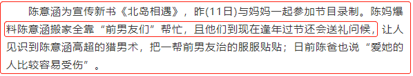 俗话说,情敌相见分外眼红,但在她这里却能和谐相处。据陈意涵妈妈爆料,她搬家全靠“前男友们”帮忙,并且与他们逢年过节期间,还会互送礼问候……
