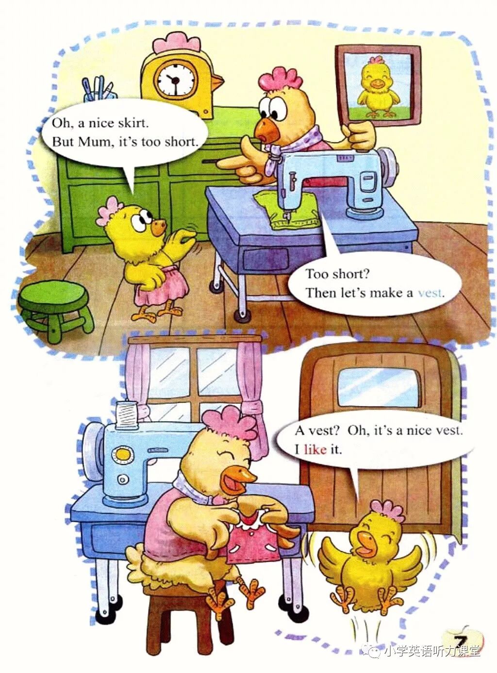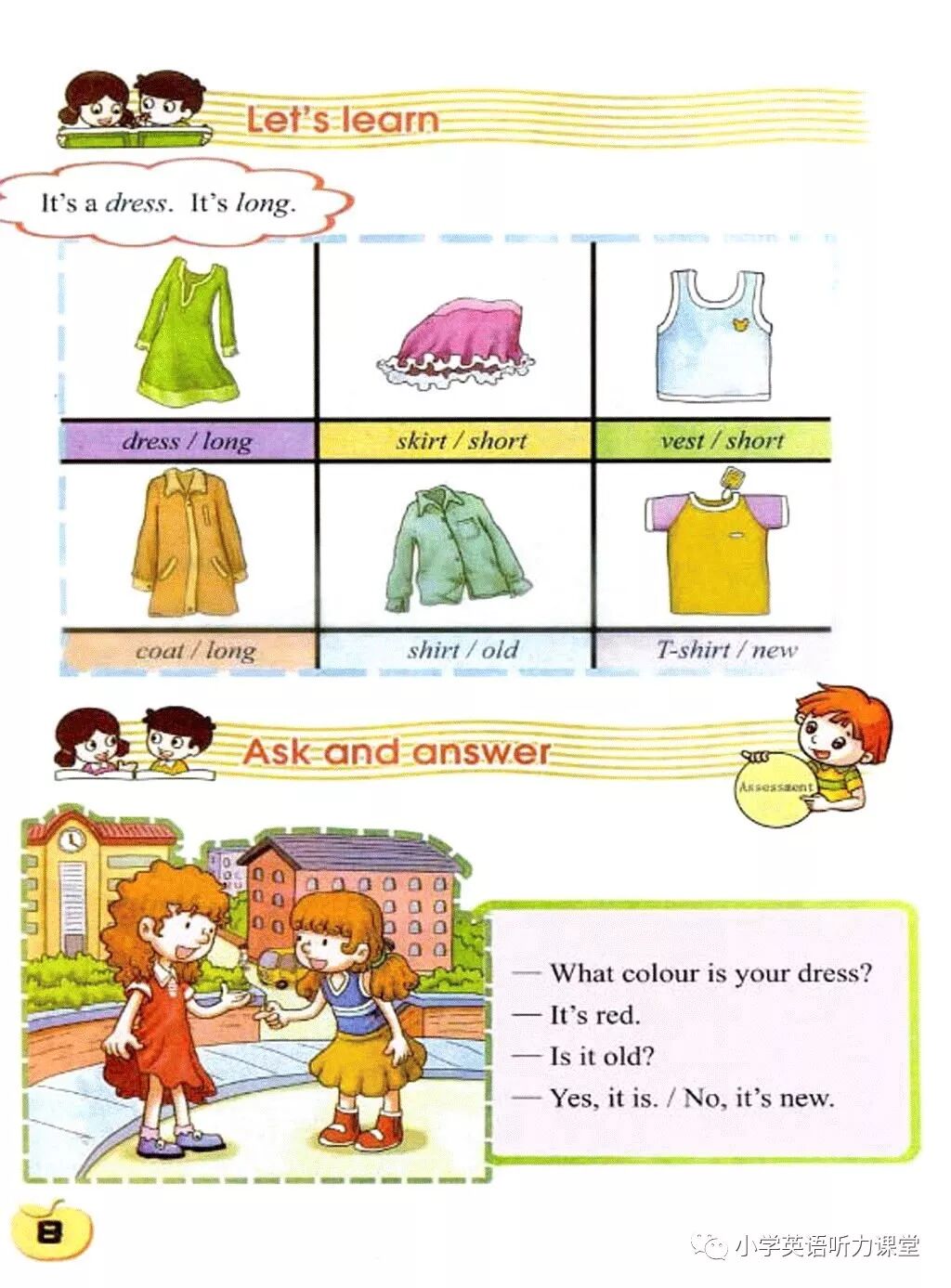 Lesson 2 IT'S TOO SHORT第2课 它太短了Let's talk说一说What's this, Mum?妈妈,这是什么?It's a dress. It's for you.它是一条连衣裙。是给你的。Thank you,谢谢您,but it's too short.但是它太短了。Too short?太短?Then let's make a skirt.那么,我们做一条短裙吧。Oh, a nice skirt.噢,一条漂亮的短裙。But Mum, it's too short.可是妈妈,它太短了。Too short?太短?Then let's make a vest.那我们做一件背心吧。A vest?一件背心?Oh, it's a nice vest.噢,一件漂亮的背心。I like it.我很喜欢它。Let's learn学一学It's a dress.它是一件连衣裙。It's long.它很长。 dress / long连衣裙/长的 skirt / short短裙/短的vest / short背心/短的coat / long外套/长的shirt / old衬衫/旧的T-shirt / newT恤衫/新的Ask and answer问与答What colour is your dress?你的连衣裙是什么颜色的?It's red.它是红色的。Is it old?它是旧的吗?Yes, it is./No, it's new.是的,它是旧的。/不,它是新的。
