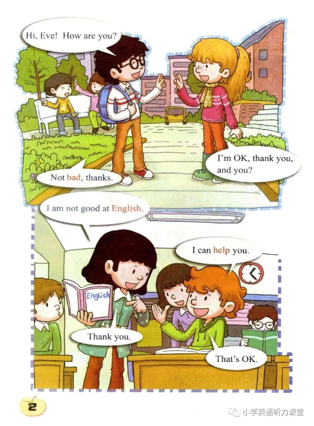 Lesson 1 I CAN HELP YOU第1课 我能帮助你Let's talk说一说Hello, Miss Li!你好,李老师!Glad to meet you again.很高兴又见到你了。Me too.我也是。Hi, Eve! How are you?嗨,伊芙!你好吗?I'm OK, thank you, and you?嗨,伊芙!你好吗?Not bad, thanks.不错,谢谢。I am not good at English.我的英语不是很好。I can help you.我可以帮你。Thank you.谢谢你。That's OK.不客气。Let's learn学一学I'm not good at English.我的英语学得不好。I can help you.我可以帮助你。English 英语Chinese 语文maths数学Let's chant唱一唱Back to school.回到学校。Back to school.回到学校。You are my friend.你是我的朋友。I'm your friend. too.我也是你的朋友。You can help me.你可以帮我。I can help you,too.我也可以帮你。