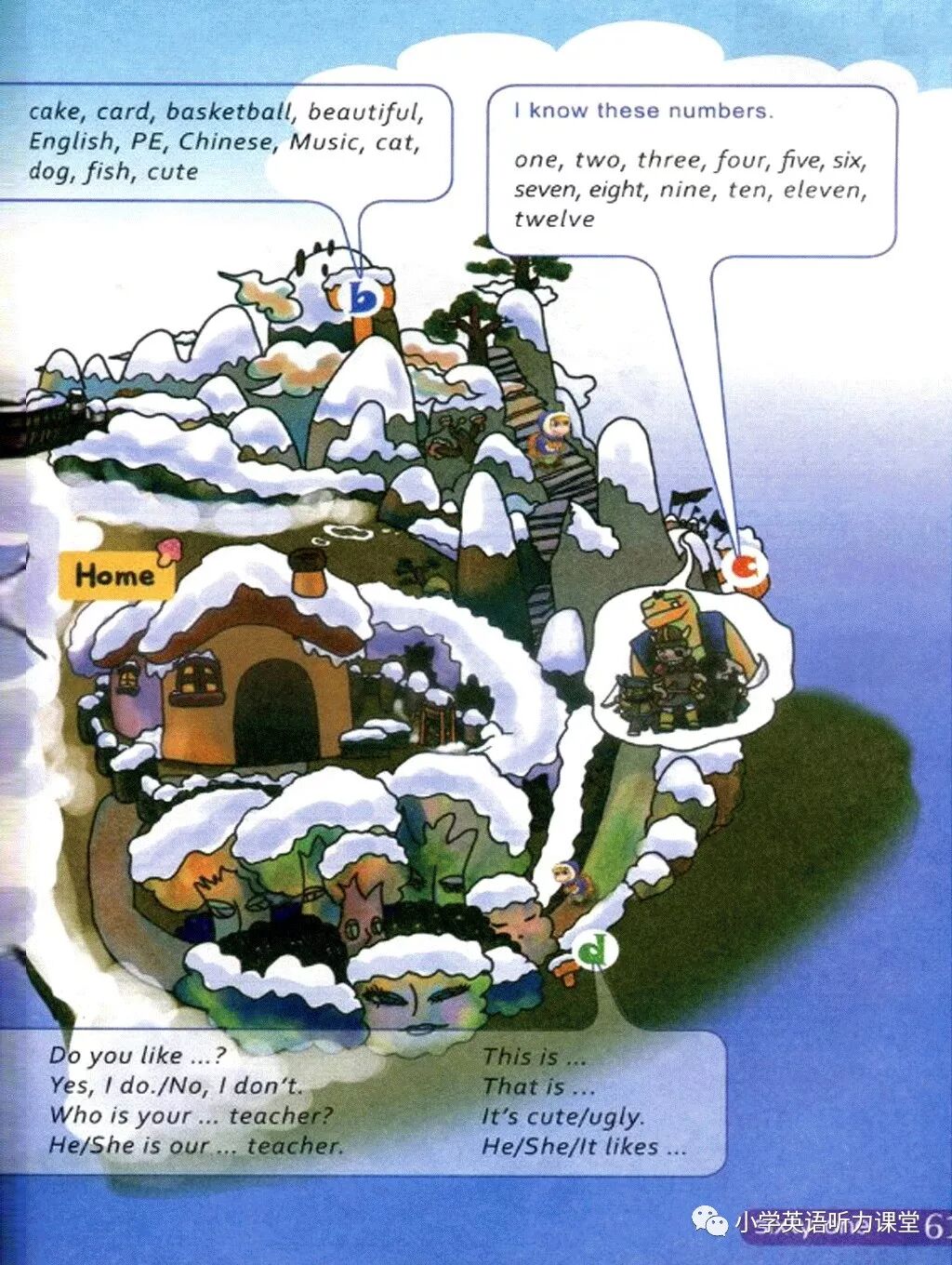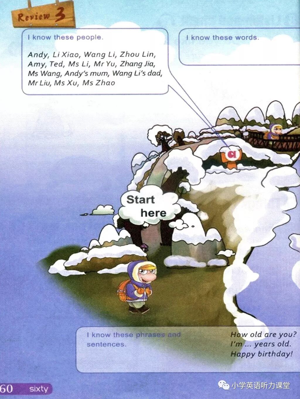 Review 3回顾3Start here!从这里开始!I know these people.我认识这些人。Andy, Li Xiao, Wang Li,安迪, 李晓, 王莉,Zhou Lin,Amy, Ted,周林,艾米,泰德,Ms Li, Mr Yu,李小姐,于先生,Zhang Jia,Ms Wang,张佳,王女士Andy’s mum, Wang Li’s dad,安迪的妈妈,王莉的爸爸,Mr Liu, Ms Xu, Ms Zhao.刘先生,徐小姐,赵女士。I know these word.我知道这些词。cake, card, basketball,蛋糕、卡片、篮球、beautiful, English, PE,漂亮,英语,体育,Chinese, Music,语文,音乐,cat, dog, fish, cute.猫,狗,鱼,可爱。I know these numbers.我知道这些数字。 one, two, three, four,一,二,三,四,five, six, seven, eight,五,六,七,八,nine, ten, eleven, twelve.九,十,十一,十二。I know these phrases and sentences.我知道这些短语和句子。How old are you?你多大了?I’m ... Years old.我…岁了。Happy birthday!生日快乐!Do you like ... ?你喜欢……吗?Yes, I do.是的,我喜欢。No, I don’t.不,我不喜欢。Who is your ... Teacher?你的……老师是谁?He / She is our ... Teacher.他/她是我们的……老师。This is ...这是……That is ...那是……It’s cute / ugly.它很可爱/丑陋。He / She / It likes...他/她/它喜欢……