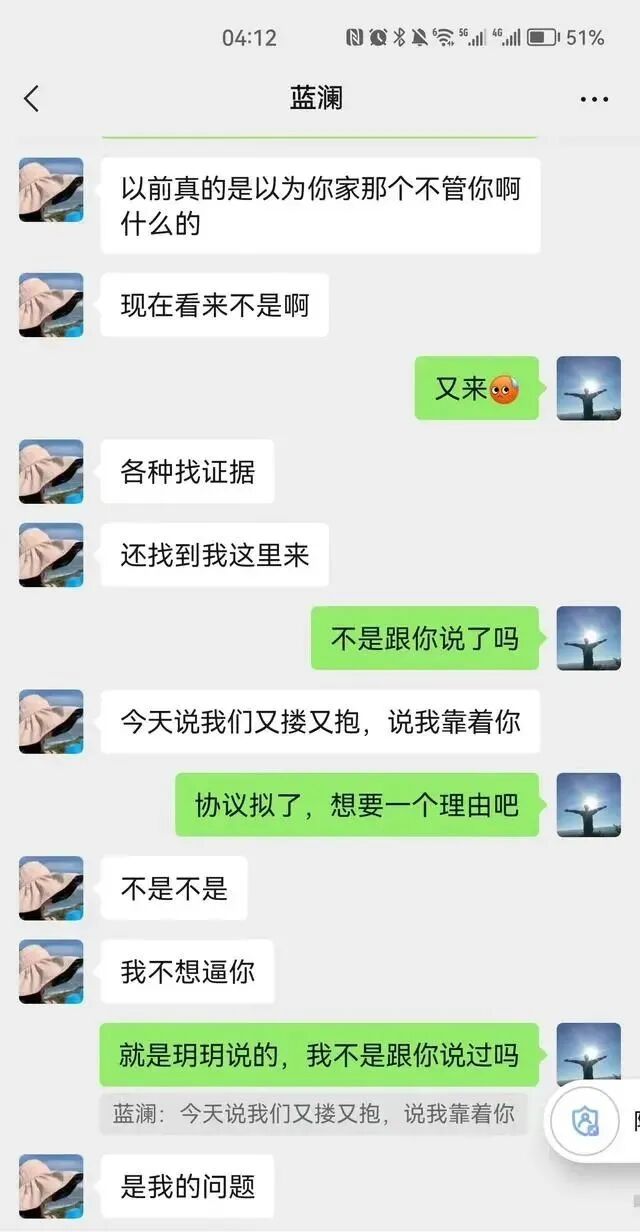 根据网络流传图片显示,二人的聊天从1月19日就已开始,直到5月27日。聊天中不时出现“想你”“爱你”“宝贝”等字眼,还有一些十分露骨的照片。对话中,一方还称不是不愿意和妻子离婚,因为房子孩子一直没谈妥,“协议拟了,想要一个理由吧。”