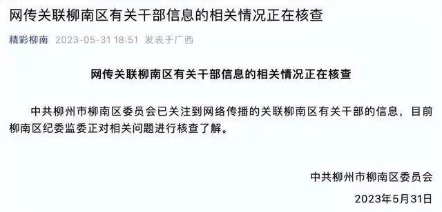 5月31日,“精彩柳南”微信公众号发布消息称,中共柳州市柳南区委员会已关注到网络传播的关联柳南区有关干部的信息,目前柳南区纪委监委正对相关问题进行核查了解。该消息随后被删除。