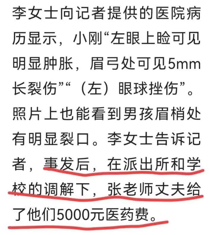 以上就是本次湖南永州师生冲突事件的全部过程。同样的,这也还是一个大概过程,出于新闻的严谨性,我们还是要强调其中的一些细节,与最终的真相还是会有出入。为了能让我们今天的陈述,更加贴近事件的真相,我们不如来看看,涉事学生家长和校方对这个事件的原话回应:此后张老师打电话喊来了丈夫夫,她的丈夫赶来后打了小刚,并用螺丝刀刺伤小刚眼角,导致流 李女士告诉记者,小刚受伤后被学校老师送到医院,在医院被同村人看见之后告诉了他们,他们才知道孩子受了伤。该工作人员表示,自己并没有全程参与此事的处理,但进行了初步了解。他介绍,张老师目前有孕在身,事发时学生在课堂上调皮,老师批评了他,随后学生骂老师,老师敲打学生,“但并没有出现恶劣殴打学生",其间,学生也打了老师。事发时,张老师打电话给了小刚的班主任,并没有打电话喊自己的老公来,她老公就住在学校,当时去看张老师时得知此事,然后没有控制住,和学生起了冲突。以上就是本次事件近乎完整的事发过程。事件发生后,双方进行了协商,并做出了初步的处理。具体的细节是,校方约谈了张老师,并对她做出批评,后面张老师家人带张老师去长沙检查身体(是动了胎气了吧?)然后在当地派出所和校方的调解下,张老师的丈夫赔偿了小刚同学5000元医药费。本以为这个事件到这里就划上句号了,但是小刚家在拿了5000元赔偿金后,又把这个事件曝光给了媒体平台。这是何用意呢?是对派出所和校方的调解不满意吗?![]()