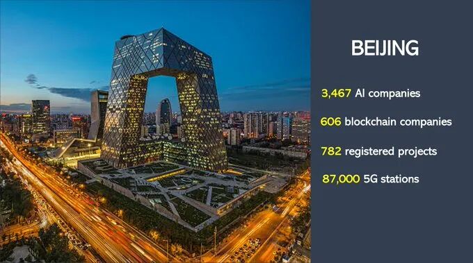 - 北京是互联网3.0的领导城市;目标是成为全球中心。目前拥有数千家AI、区块链和VR/AR公司以及国家发展中心和87,000个5G基站。