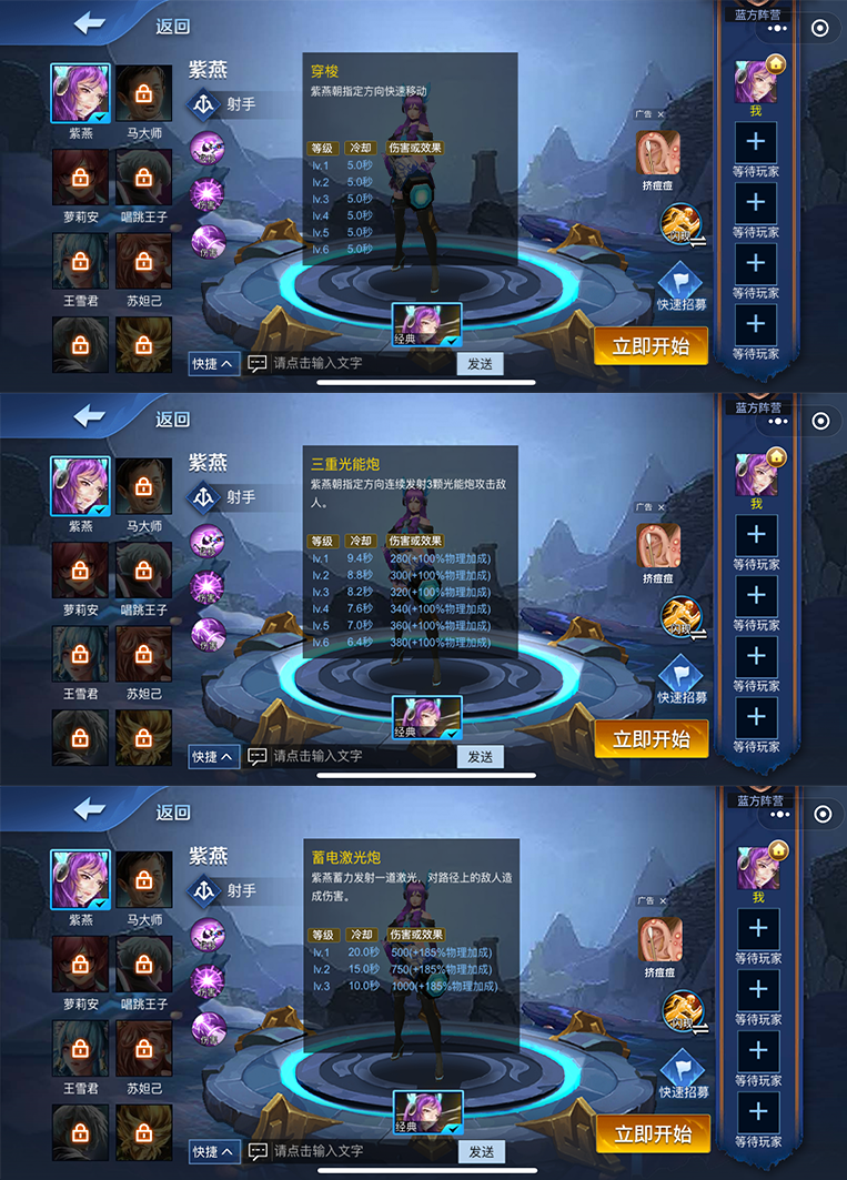 2 技能(三重光能炮):紫燕朝指定方向连续发射 3 颗光能炮攻击敌人(主要输出技能)3 技能大招(蓄电激光炮):紫燕蓄力发射一道激光,对路径上的敌人造成伤害(很像 LOL 光辉的大招)