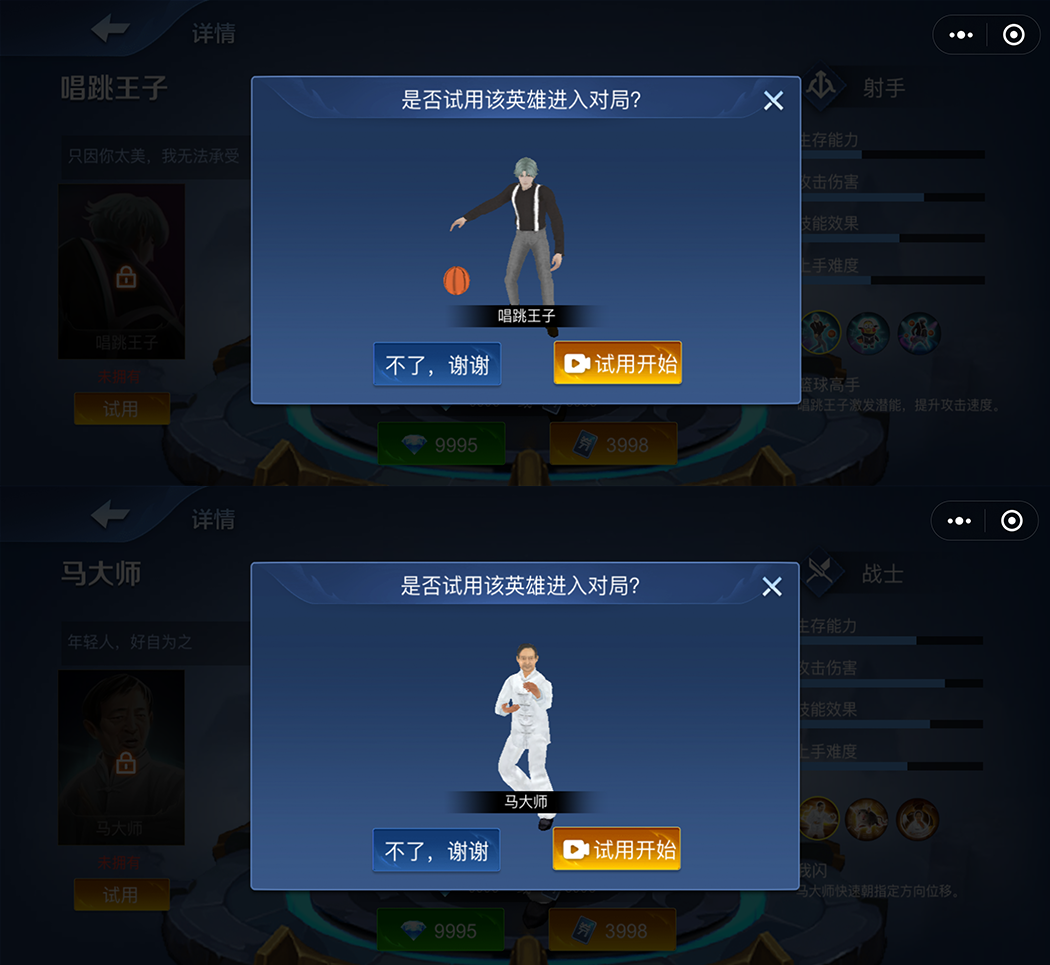 不吹不黑,要不是因为受限于小程序,在贴图质量、手感等有点差之外,紫燕耍起来真的比孙尚香还好玩。像前面提到的 “ 唱跳王子 ” 跟 “ 马大师 ” 都是要 9995 钻石跟 3998 点券。氪金是不可能氪金的,靠签到活动啥的,估计得玩到猴年马月。而搞这个游戏的人也懂,所以 “ 贴心 ” 的给出了试用的选项。果子这边在忍受了 60 秒的广告后,终于把这两大英雄给白嫖到。首先是 “ 只因你太美,我无法承受 ” 的唱跳王子。1 技能(篮球高手):唱跳王子激发潜能,提升攻击速度(强化类技能)