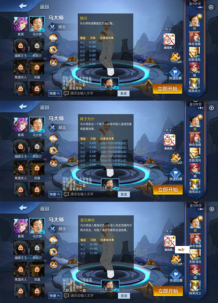 但被击倒后,你可以通过看 30 秒广告 “ 加强复活 ” 。这就蛮过分的,阵亡一次看完广告后,就顶一件装备了,直接把发育给追平。不过也有些英雄前期就很顶,比如 “ 马大师 ” 。1 技能(我闪):马大师快速朝指定方向位移(位移技能)