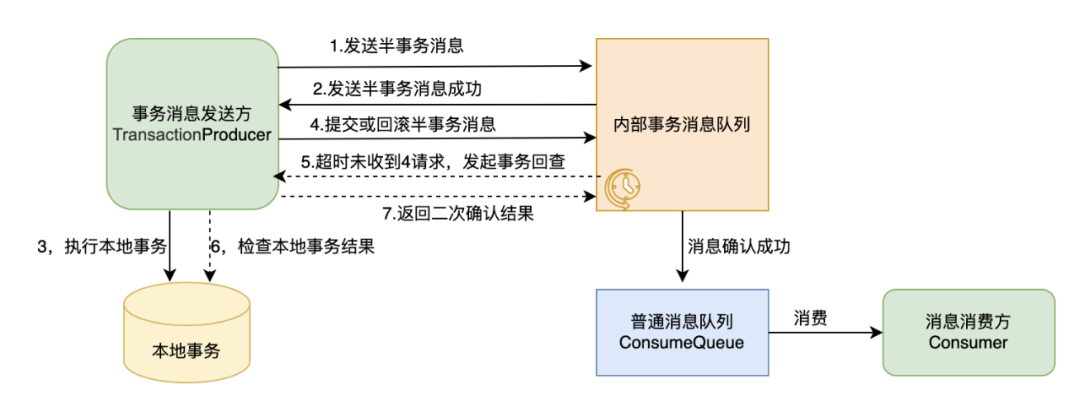 事务消息是 Apache RocketMQ 提供的一种高级消息类型,支持在分布式场景下保障消息生产和本地事务的最终一致性,尤其是在对数据一致性要求高的交易场景有广泛的应用,主要核心过程如下。