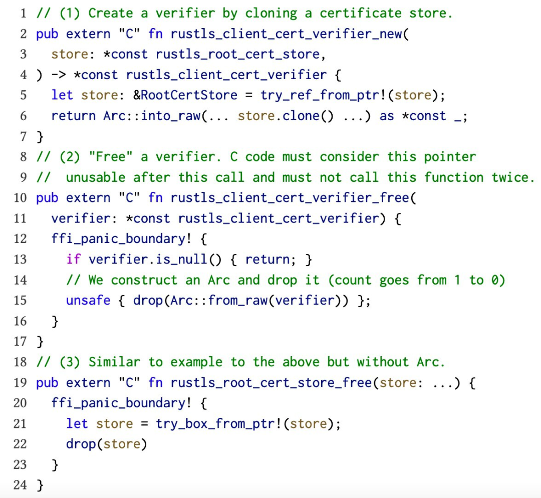 图一:rusTLS FFI 函数中的安全问题示例。异常安全:(1)如果克隆操作耗尽内存,则可引发跨 FFI 边界展开。时间安全:(2)和(3)可能因不正确的函数参数或重复函数调用而导致 use-after-free 和 double-fee 错误。