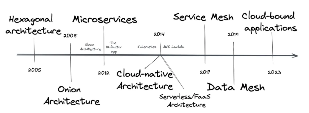 在应用程序架构演变时间线的后半段,容器的采用和 Kubernetes 的引入成为主流,彻底改变了应用打包、协调的方式。AWS Lambda 引入了高度可扩展的功能即服务(FaaS)的概念,将应用程序细粒度概念再度拔高,将完整的基础设施管理责任卸至云供应商。其他如服务网格、Mecha 架构等技术潮流的出现,网络和分布式开发者基元等非功能性应用栈平价化并剥离至 sidecar 中。受微服务启发,数据网格架构设计意图将应用程序的数据分析架构拆分至更小的独立数据域中,让每个域都有自己的项目和团队。再加上近期的应用为先云服务等等,这一系列技术潮流开始重塑应用程序的外部架构,本文中我将这些统一称为“云绑定应用”。