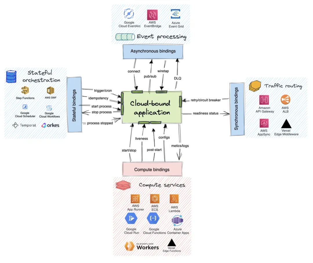 虽然应用的大小和复杂度随单体应用或函数而不同,但基本都会封装在容器内,具有健康检查端点,实现了生命周期钩子,并有指标暴露。理解计算绑定有助于高效使用任何基于容器的计算平台,无论是企业内部的 Kubernetes 集群,还是 AWS ECS、谷歌云运行、Azure 容器应用等管理型容器服务,基于函数的运行时 AWS Lambda、GCP 函数等等,以及基于边缘运行时的 Vercel 边缘函数、CloudFlare 工作者、Netlify 边缘函数等等。这些开放和事实标准的 API 不仅能协助创建可移植应用程序,还能通过跨云供应商和服务提供方的操作方法和工具,避免被供应商锁定。