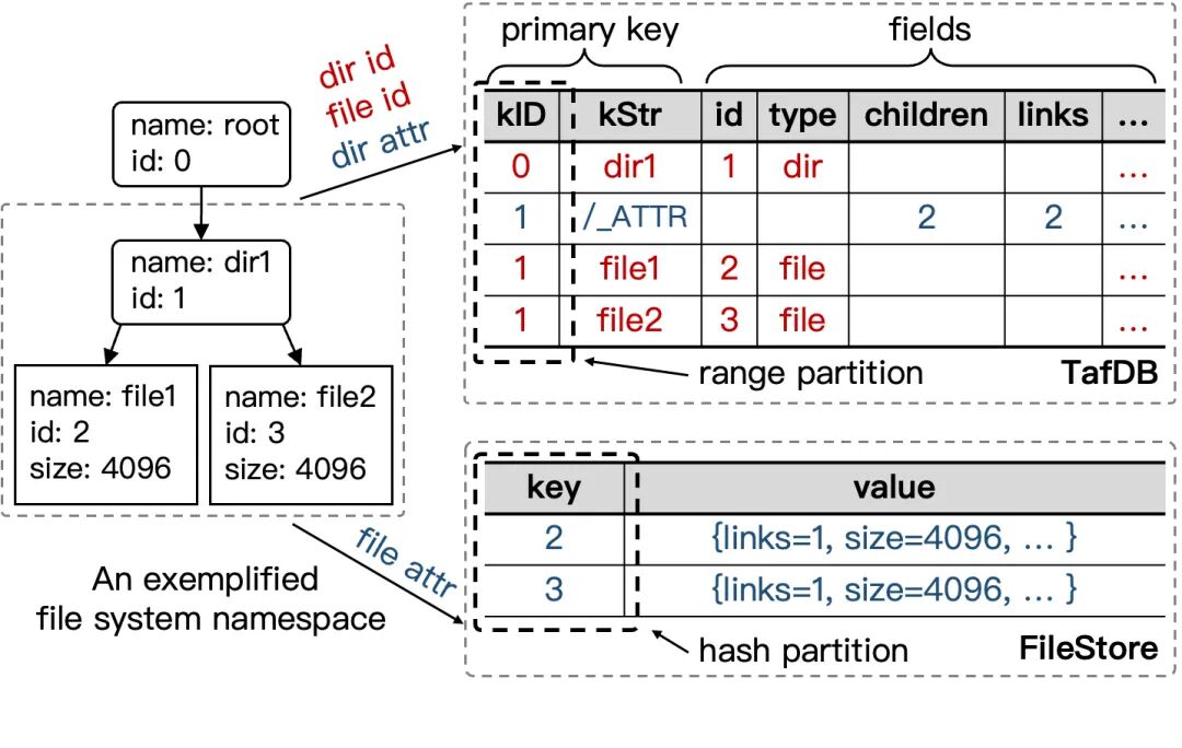 Namespace 存储层(TafDB):TafDB 负责存储层级命名空间里除文件属性外的其它部分;