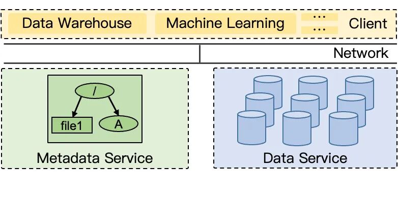 二十多年前,随着 GFS、HDFS 等分布式文件系统的兴起,元数据和数据分离的架构逐渐成为分布式文件系统领域的主流共识。这种架构将整个系统分成负责元数据的元数据服务(Metadata Service)和负责数据的数据服务(Data Service)两个部分。