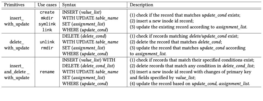 我们归纳了所有的 POSIX 操作,最后总结出三种原语,如下表所示,表中同时标注了每种原语的使用范围、类 SQL 形式的接口描述和简要的执行过程: